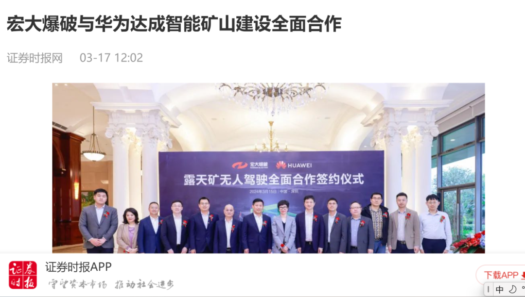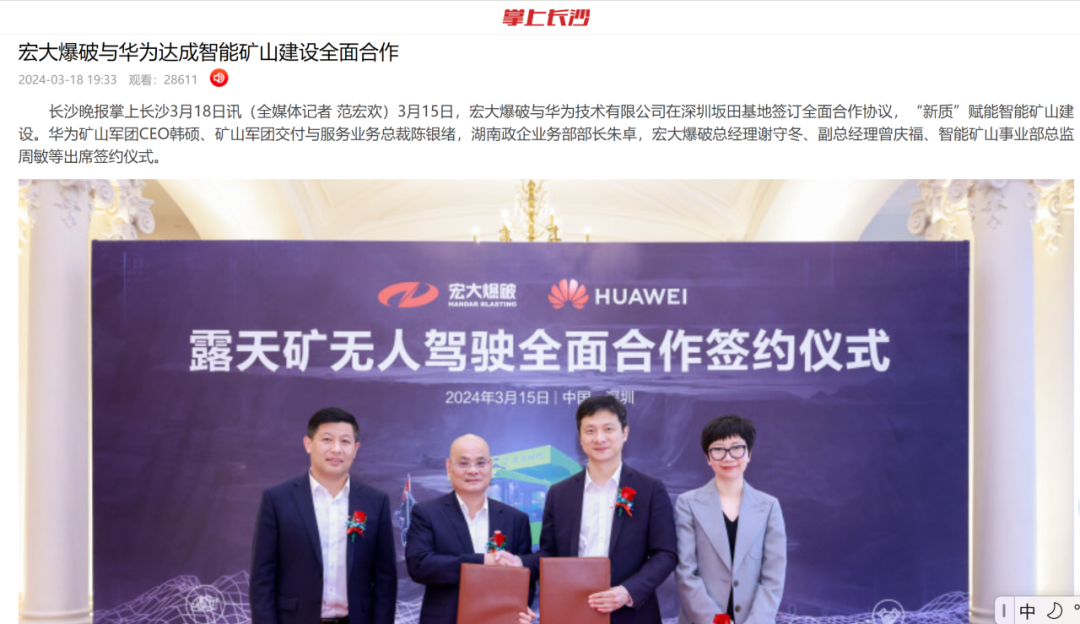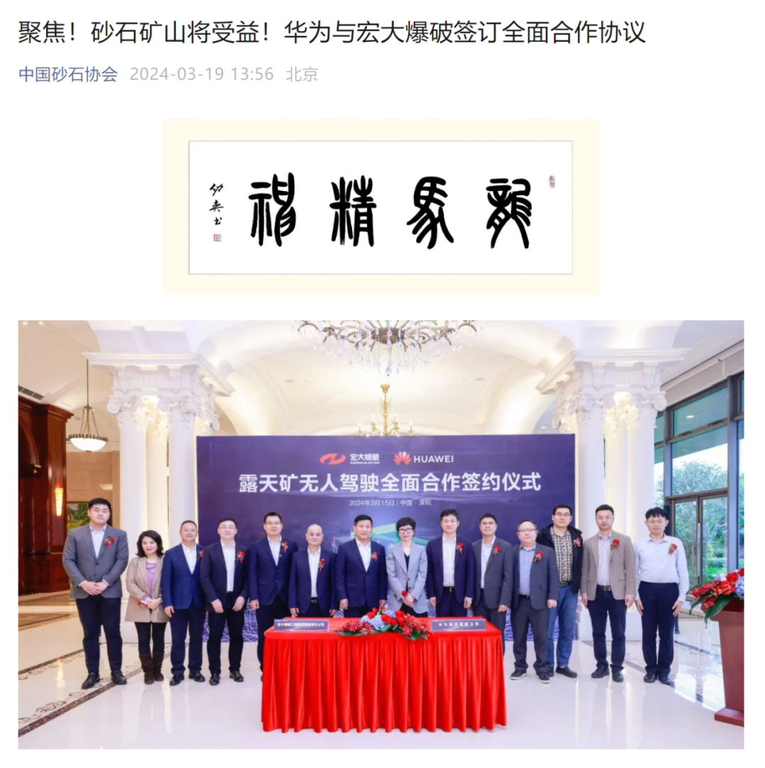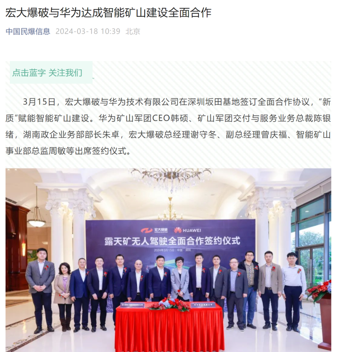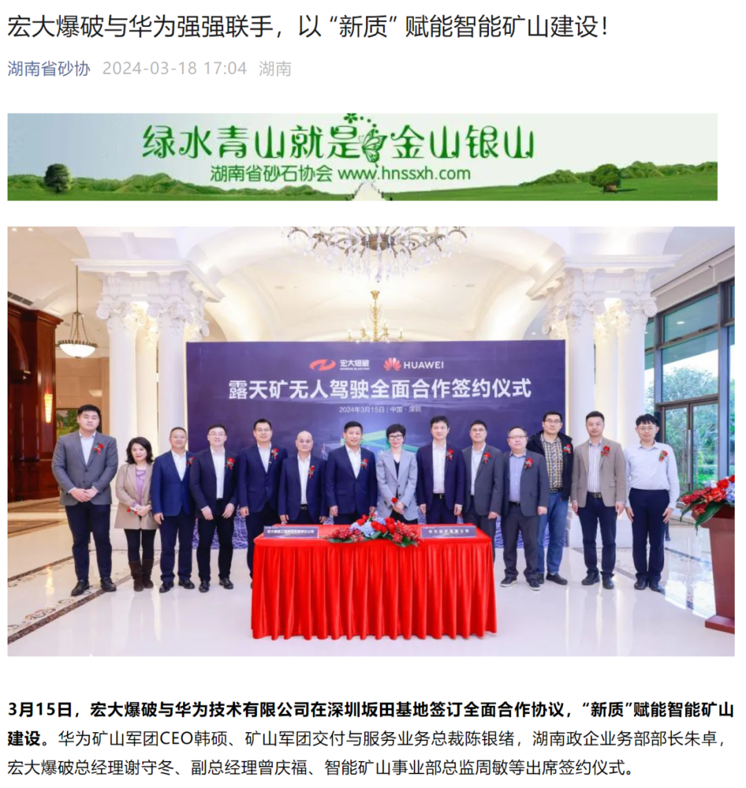 新華網(wǎng)、中國礦業(yè)報、中國證券報、湖南日報、長沙晚報、紅網(wǎng)、國際煤炭網(wǎng)、中國砂石協(xié)會、中國有色網(wǎng)、煤炭科學(xué)研究院、中國民爆信息網(wǎng)、IntelMining礦業(yè)智能科技服務(wù)、中國有色網(wǎng)、中國鋼鐵新聞網(wǎng)、鳳凰網(wǎng)、財經(jīng)網(wǎng)、騰訊網(wǎng)等媒體對簽約情況及雙方規(guī)劃進行了廣泛報道。其中,中國礦業(yè)報在3月20日砂石周刊版以《宏大爆破與華為合作推進智能礦山建設(shè)》為題刊登報道;湖南日報在3月20日要聞版以《華為助力湖南智能礦山建設(shè)》為題作報道。