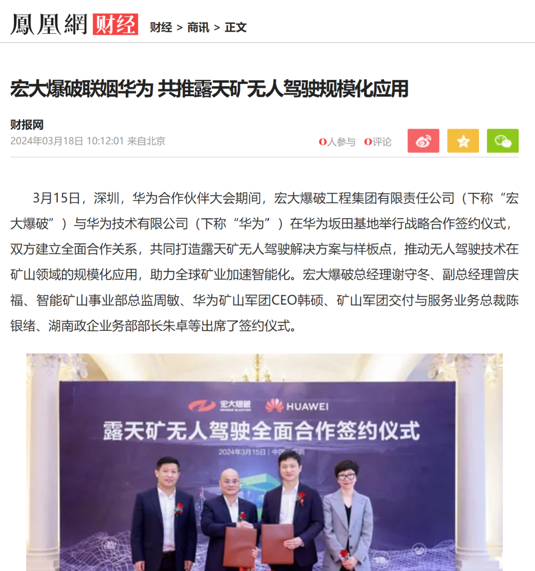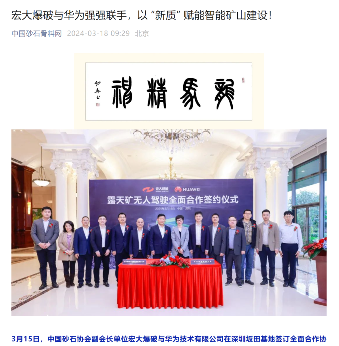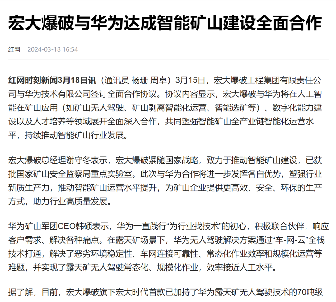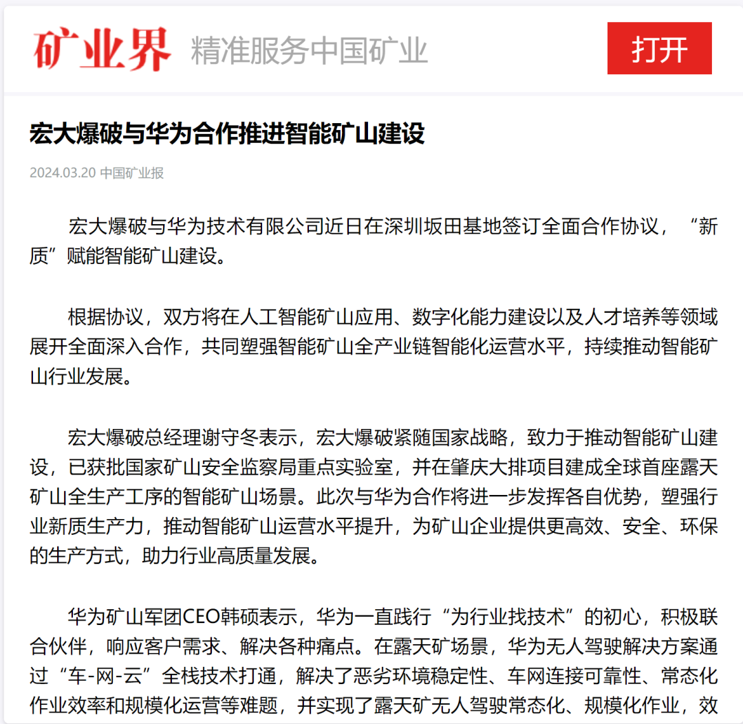 新華網(wǎng)、中國礦業(yè)報、中國證券報、湖南日報、長沙晚報、紅網(wǎng)、國際煤炭網(wǎng)、中國砂石協(xié)會、中國有色網(wǎng)、煤炭科學(xué)研究院、中國民爆信息網(wǎng)、IntelMining礦業(yè)智能科技服務(wù)、中國有色網(wǎng)、中國鋼鐵新聞網(wǎng)、鳳凰網(wǎng)、財經(jīng)網(wǎng)、騰訊網(wǎng)等媒體對簽約情況及雙方規(guī)劃進行了廣泛報道。其中,中國礦業(yè)報在3月20日砂石周刊版以《宏大爆破與華為合作推進智能礦山建設(shè)》為題刊登報道;湖南日報在3月20日要聞版以《華為助力湖南智能礦山建設(shè)》為題作報道。