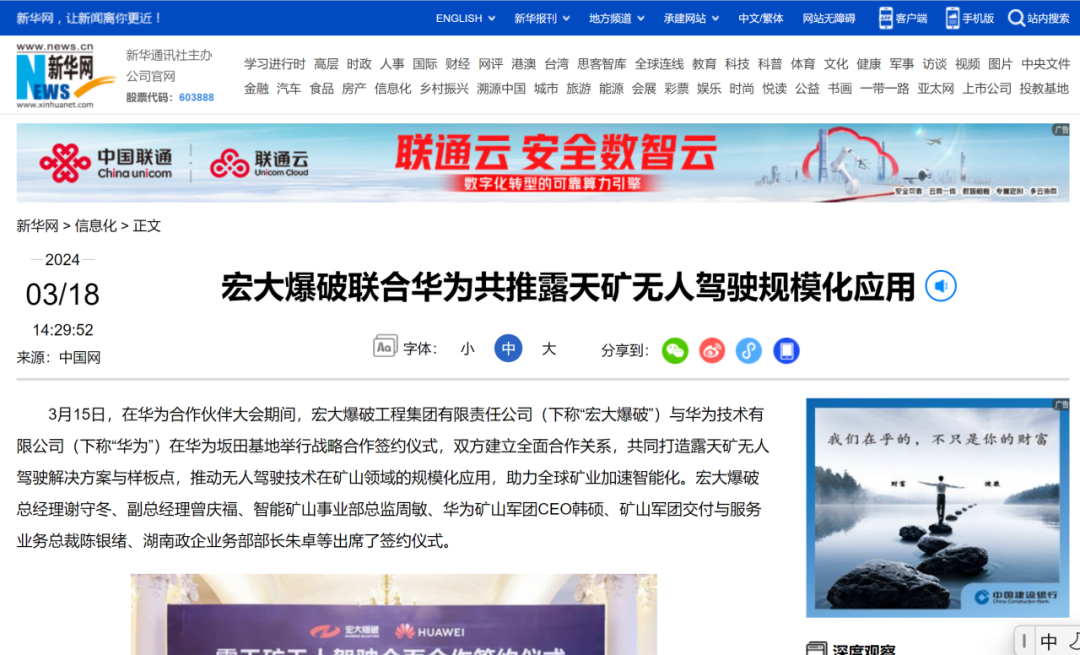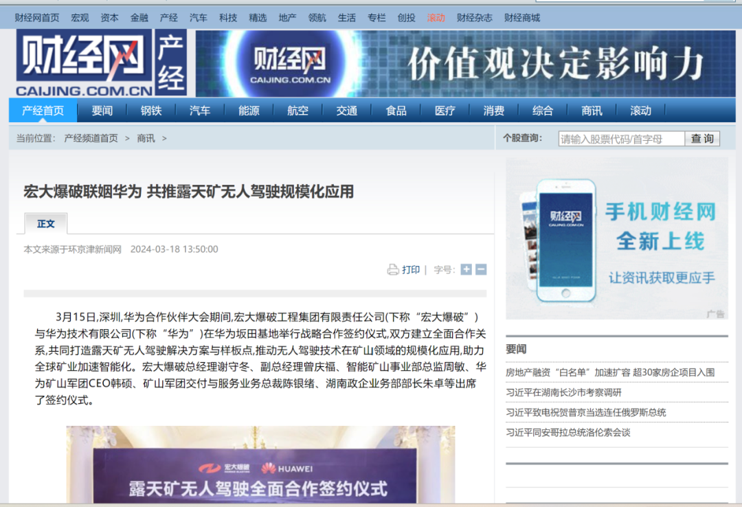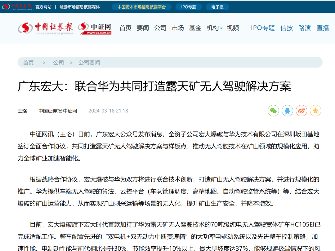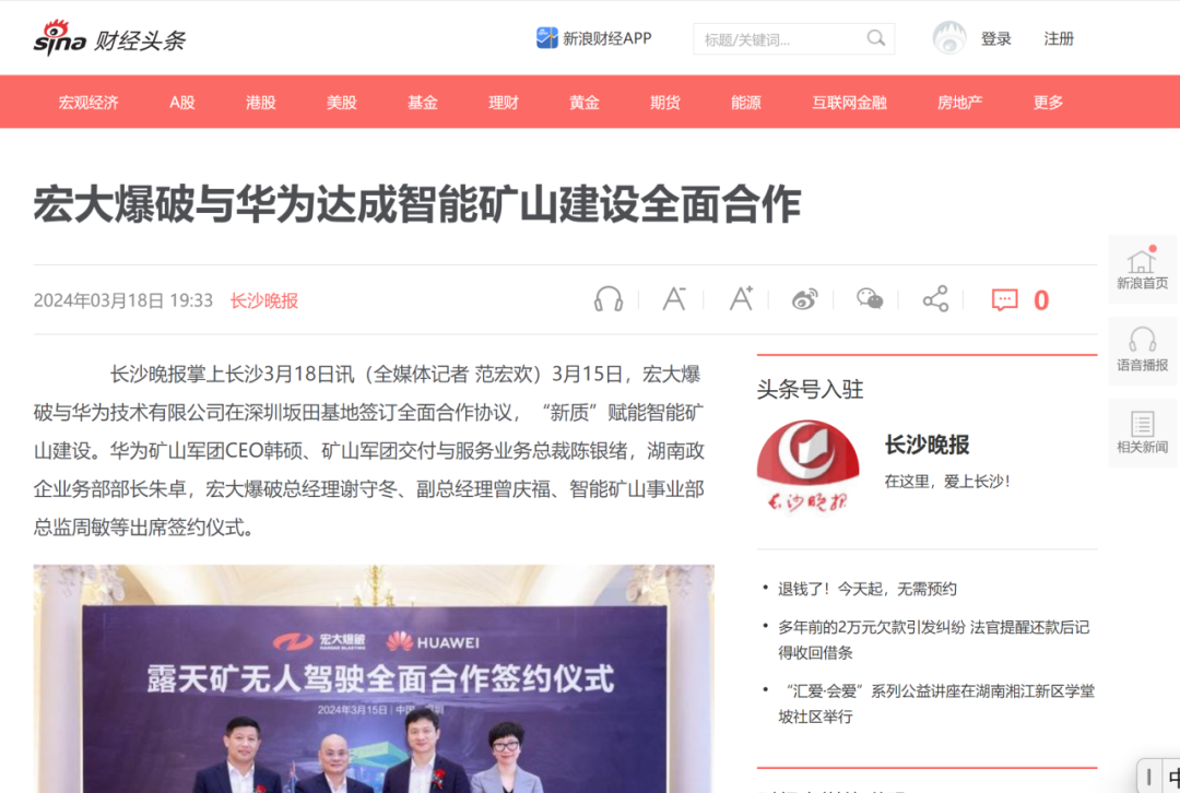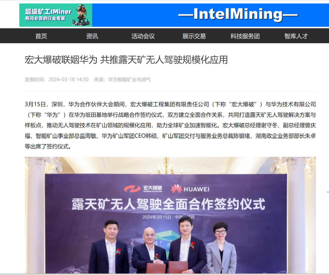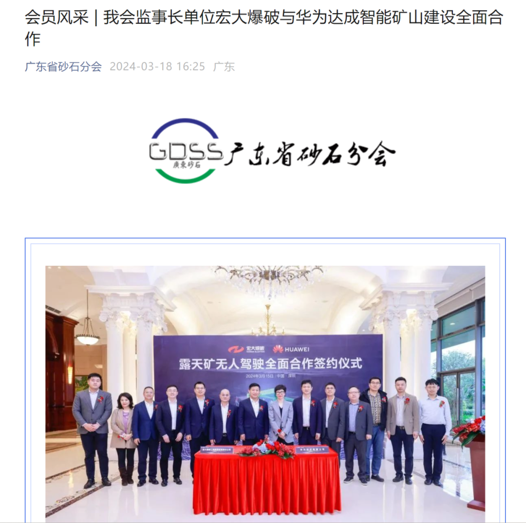 新華網(wǎng)、中國礦業(yè)報、中國證券報、湖南日報、長沙晚報、紅網(wǎng)、國際煤炭網(wǎng)、中國砂石協(xié)會、中國有色網(wǎng)、煤炭科學(xué)研究院、中國民爆信息網(wǎng)、IntelMining礦業(yè)智能科技服務(wù)、中國有色網(wǎng)、中國鋼鐵新聞網(wǎng)、鳳凰網(wǎng)、財經(jīng)網(wǎng)、騰訊網(wǎng)等媒體對簽約情況及雙方規(guī)劃進行了廣泛報道。其中,中國礦業(yè)報在3月20日砂石周刊版以《宏大爆破與華為合作推進智能礦山建設(shè)》為題刊登報道;湖南日報在3月20日要聞版以《華為助力湖南智能礦山建設(shè)》為題作報道。